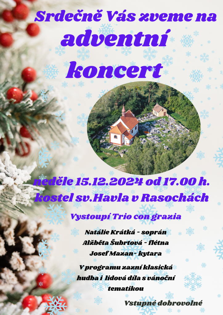 Přijďte si užít adventní koncert v kostele sv. Havla, který se koná v neděli 15. prosince 2024 od 17.00 hodin. Na programu bude klasická hudba i lidová díla s vánoční tematikou. Vstupné je dobrovolné.
