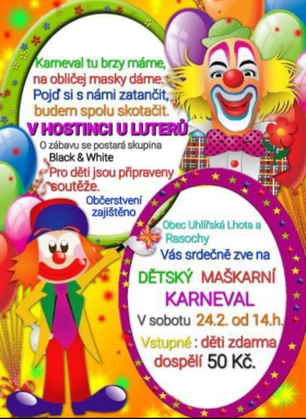 Zveme Vás na dětský karneval, který se bude konat v sobotu 24.2.2024 od 14.00 hodin v hostinci U Luterů v Rasochách.