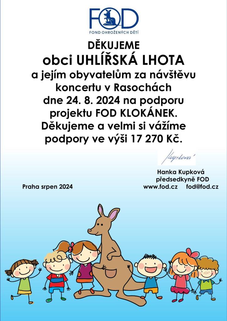 Poděkování za příspěvek při charitativním koncertu.