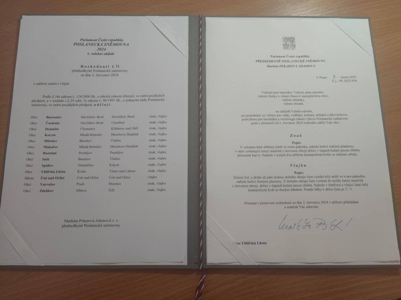 Předávání dekretů o udělení znaků a vlajek obcím, městysům a městům ČR